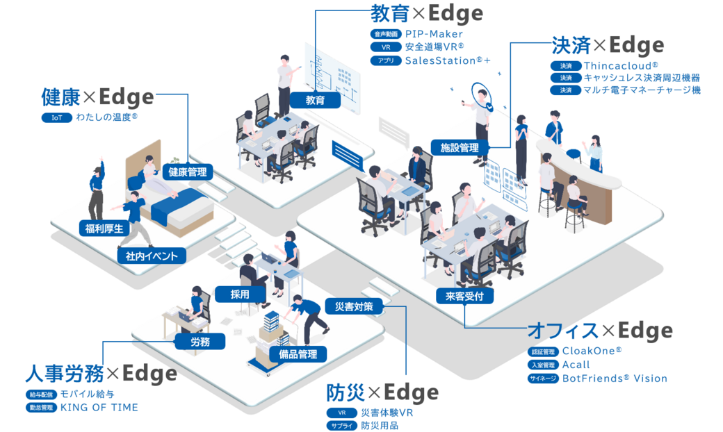 弊社はID情報の一元化と多様な認証手段の提供や、クラウドサービスやAIチャットボット搭載のデジタルサイネージなどの提供を通じて、お客さまのオフィスDXを支援し、これらの課題を包括的に解決します。