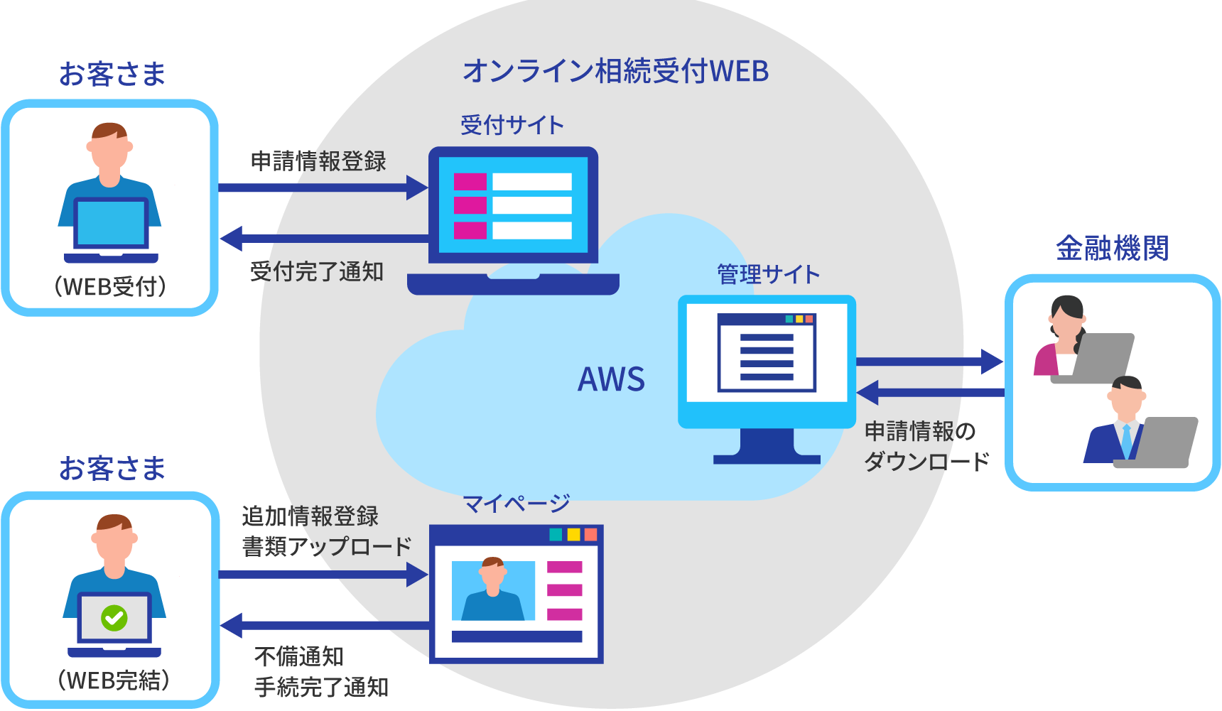 お客さまから相続の申請を受け付ける申請サイトと、申請内容をCSVやPDFで出力可能な管理サイトをご提供します。 お客さまは個別のマイページ上で書類の提出や不備があった際の再提出が可能です。